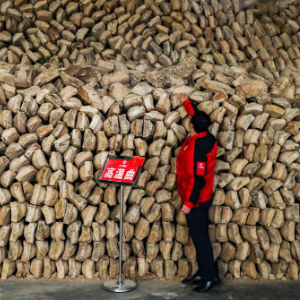 11月21日,在甘肃陇南经济开发区一家白酒企业厂区,甘肃省级非遗红川酒酿造技艺传承人张博在观察古法制作的酒曲干燥情况。