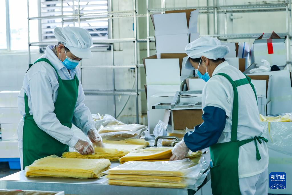11月21日,在甘肃陇南经济开发区一家豆制品企业厂区,工人在分拣豆皮。该企业生产的豆制品出口美国、泰国、澳大利亚等20多个国家。