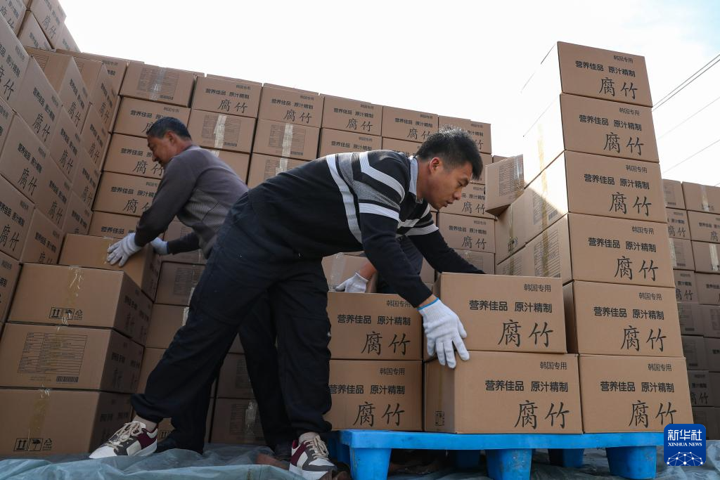 11月21日,在甘肃陇南经济开发区一家豆制品企业厂区,工人将发往韩国的腐竹装车。该企业生产的豆制品出口美国、泰国、澳大利亚等20多个国家。