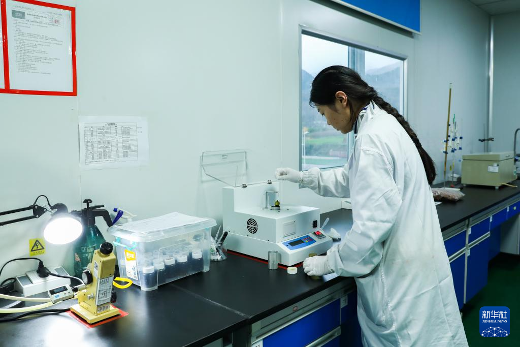 11月21日,在甘肃陇南经济开发区一家生物科技企业实验室,工作人员在检测花椒油产品的相对密度。