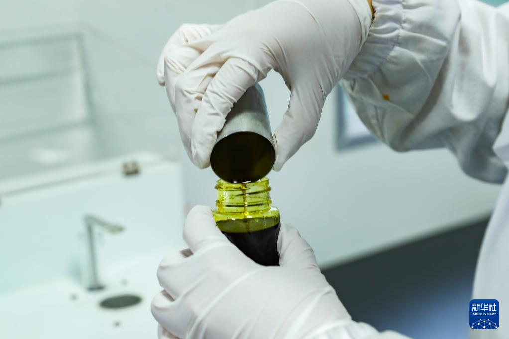 11月21日,在甘肃陇南经济开发区一家生物科技企业实验室,工作人员将花椒油产品倒入容器。