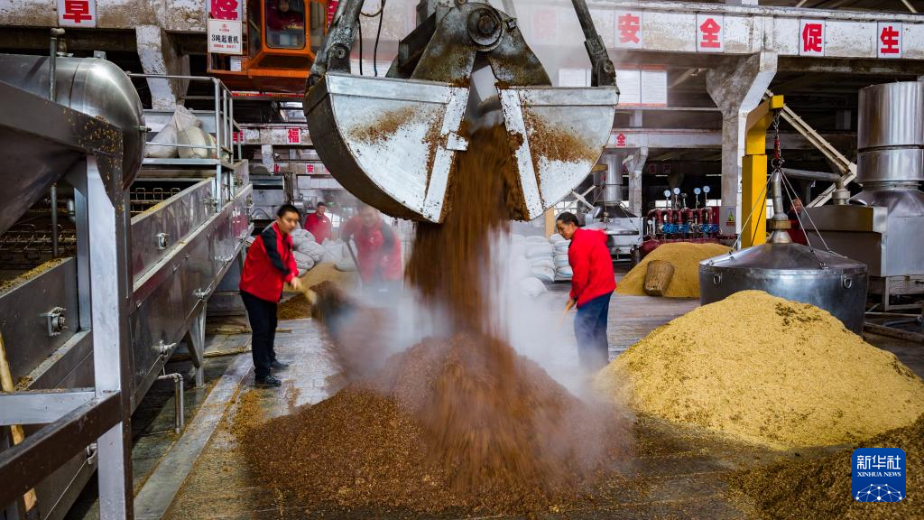 11月21日,在甘肃陇南经济开发区一家白酒企业厂区,工人按照传统技艺酿造白酒(无人机照片)。