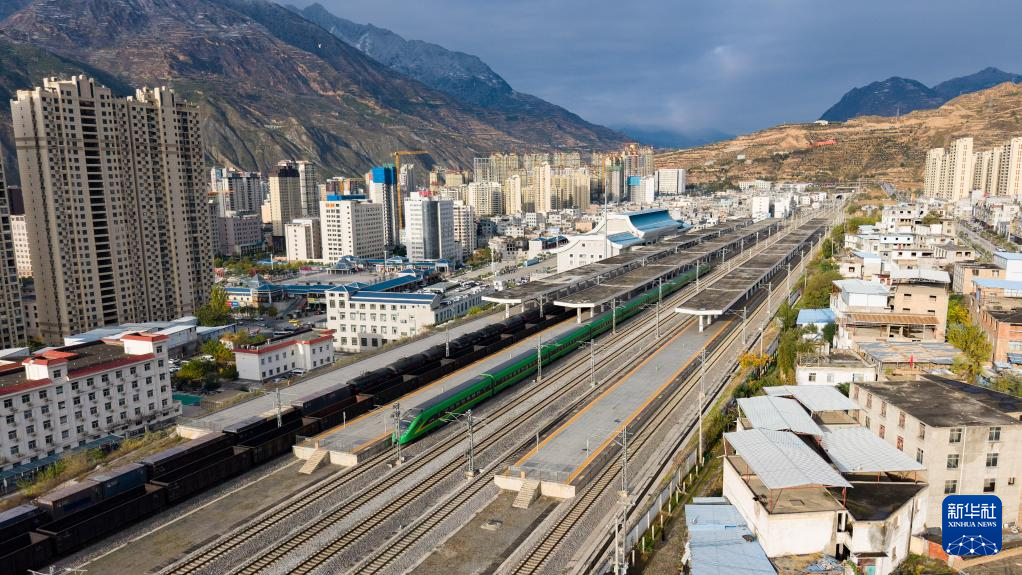 在甘肃省陇南市武都区兰渝铁路陇南站,动车组列车停靠在站台(11月25日摄,无人机照片)。