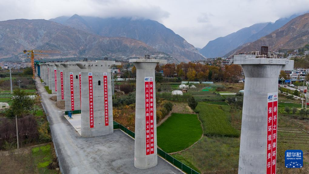 11月24日,在陇南市武都区两水镇,施工人员在天陇铁路关键性工程陇南西特大桥开展钢筋绑扎作业(无人机照片)。