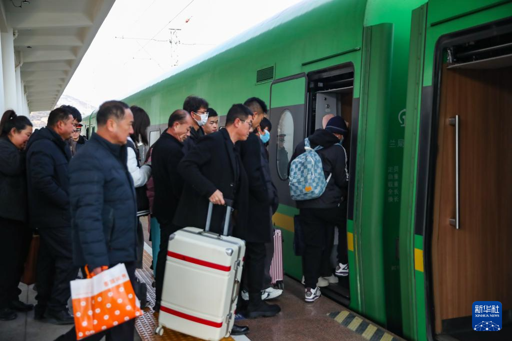 11月25日,在甘肃省陇南市宕昌县的兰渝铁路哈达铺站,旅客排队登上动车组列车。