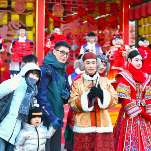 11月25日,游客在银川市漫葡·看见贺兰沉浸式演艺小镇与演员合影。