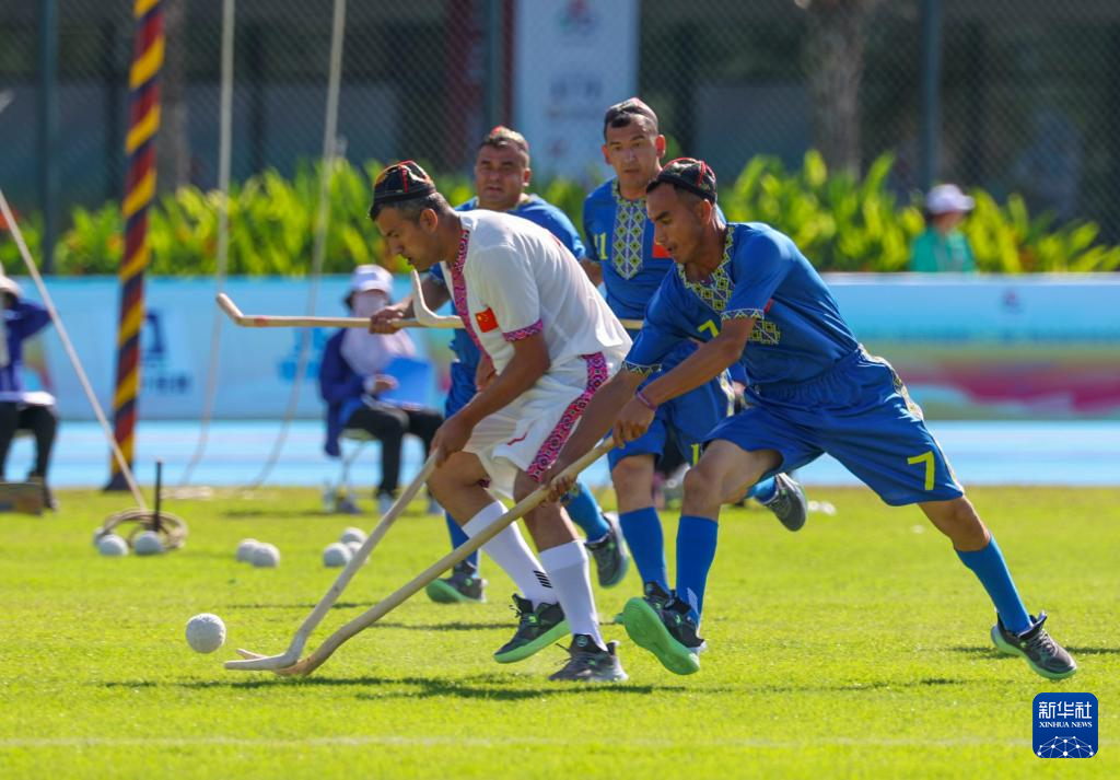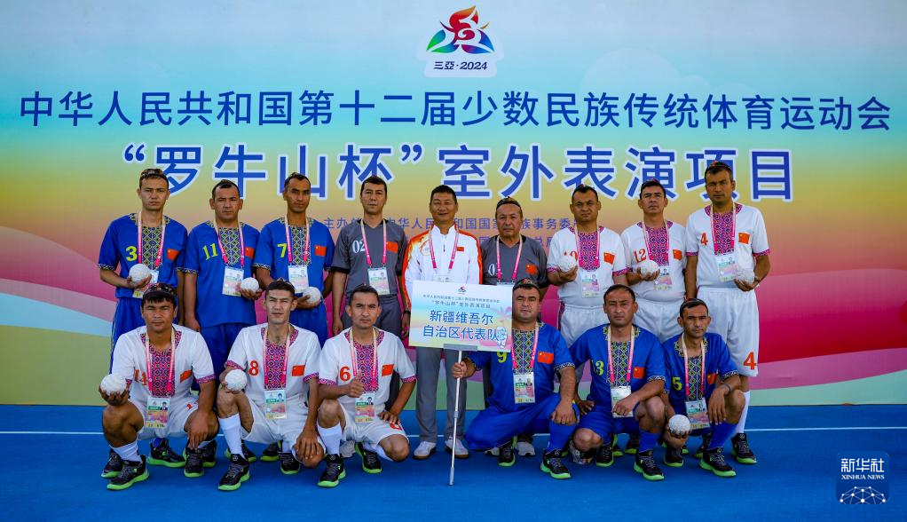 这是11月24日,在三亚市体育中心举行的第十二届全国少数民族传统体育运动会室外表演项目中,新疆队球员阿卜杜拉艾孜则·阿卜杜海娃尔(前右)在麦热球表演中。