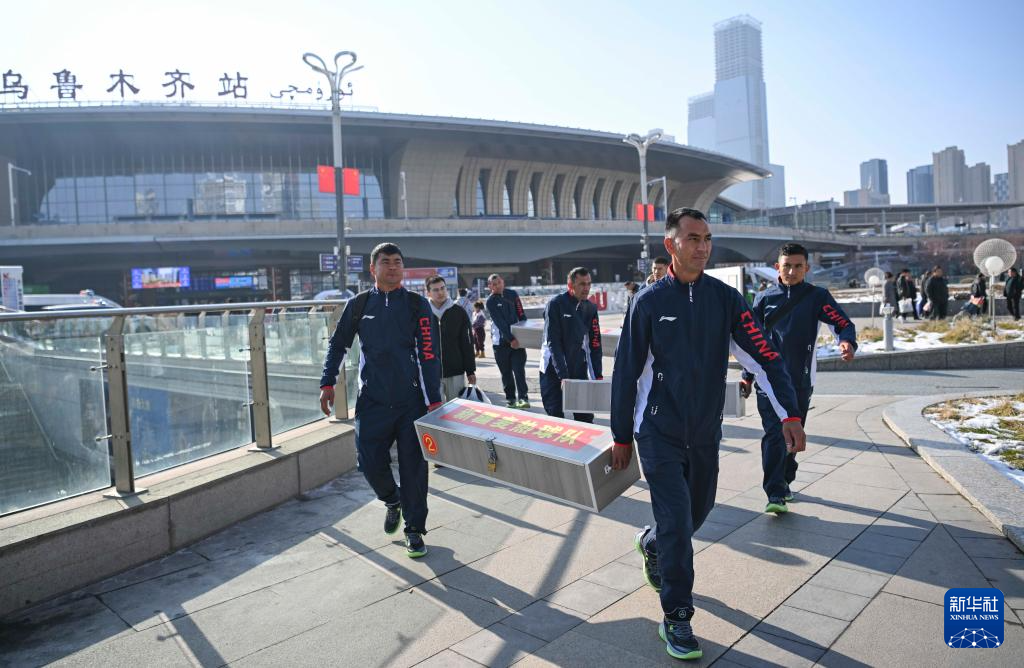 这是11月17日,阿卜杜拉艾孜则·阿卜杜海娃尔(前右)和队友携带比赛装备从于田抵达乌鲁木齐站。