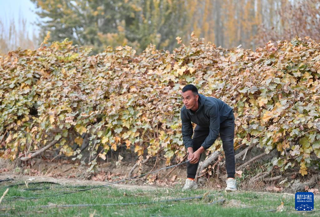 这是11月8日,在新疆于田县先拜巴扎镇萨依巴格村,阿卜杜拉艾孜则·阿卜杜海娃尔在冬小麦田间检查滴灌带。