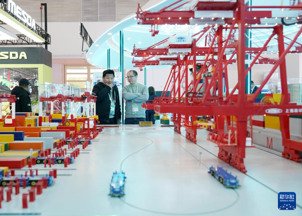 11月27日,人们在第二届中国国际供应链促进博览会先进制造链展区中交集团展台参观上海洋山四期自动化码头模型。