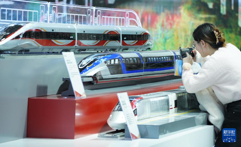 11月27日,参观者在链博会先进制造链展区拍摄中国中车展位上的高铁模型。