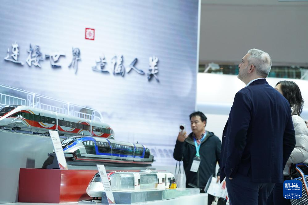 11月27日,一名外国参观者在链博会先进制造链展区参观中国中车展位。