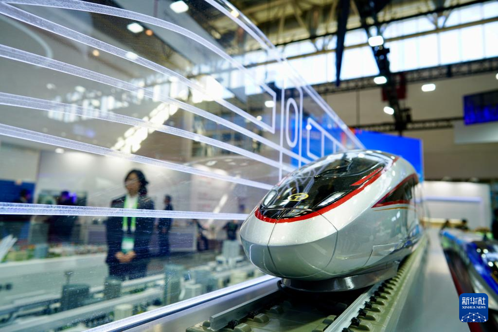 这是11月27日在第二届中国国际供应链促进博览会先进制造链展区中国中车展台拍摄的“CR400BF-Z复兴号智能动车组”模型。
