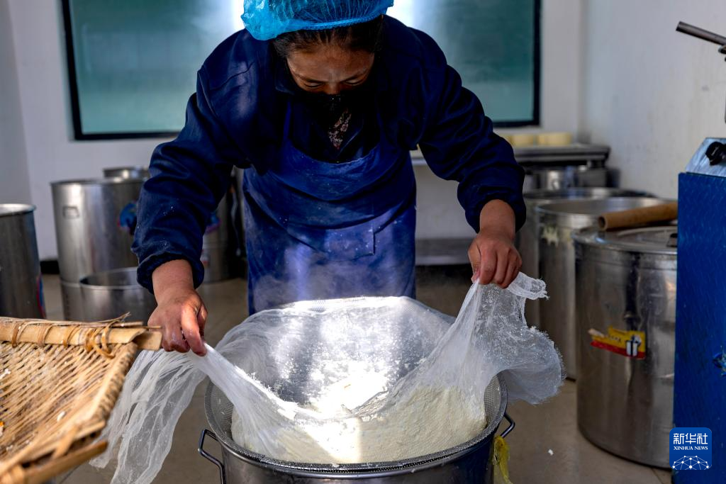 11月28日,在基地就业的当地员工索朗卓玛在用传统工艺制作奶渣。