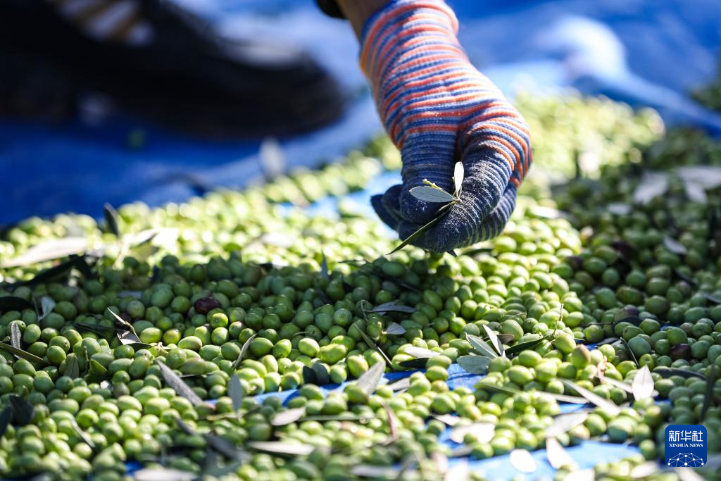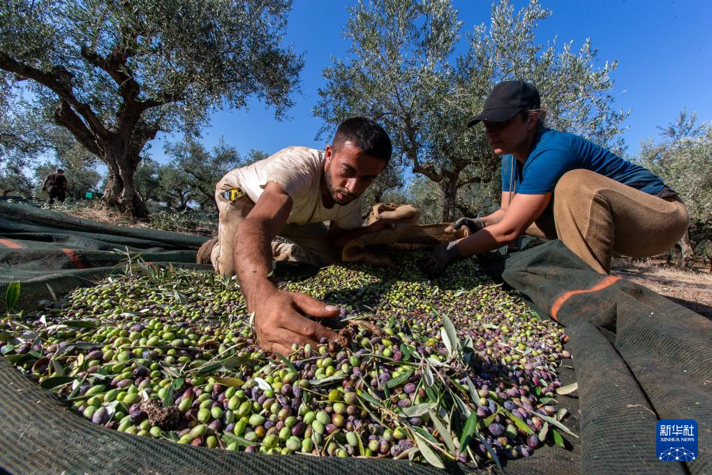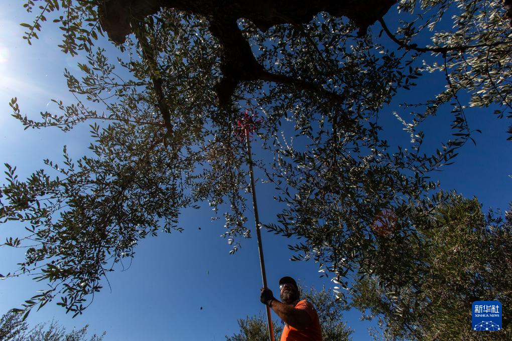 11月2日,人们在希腊伯罗奔尼撒半岛麦西尼亚收获油橄榄。