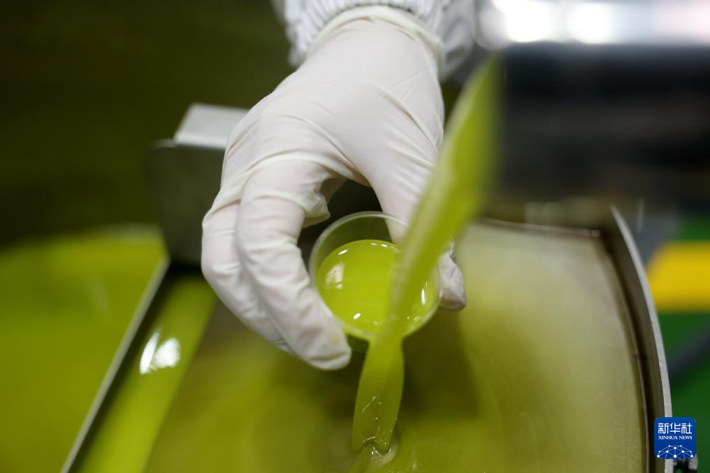 10月31日,在甘肃省陇南市武都区一家油橄榄加工企业,工作人员查看初榨橄榄油品质。
