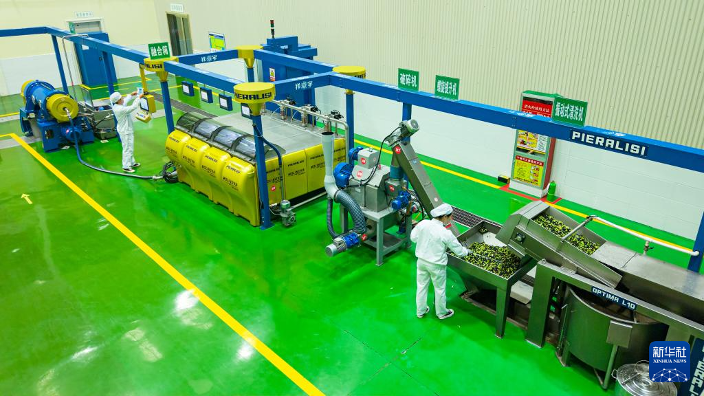 10月31日,在甘肃省陇南市武都区一家油橄榄加工企业,工作人员在生产线上作业。