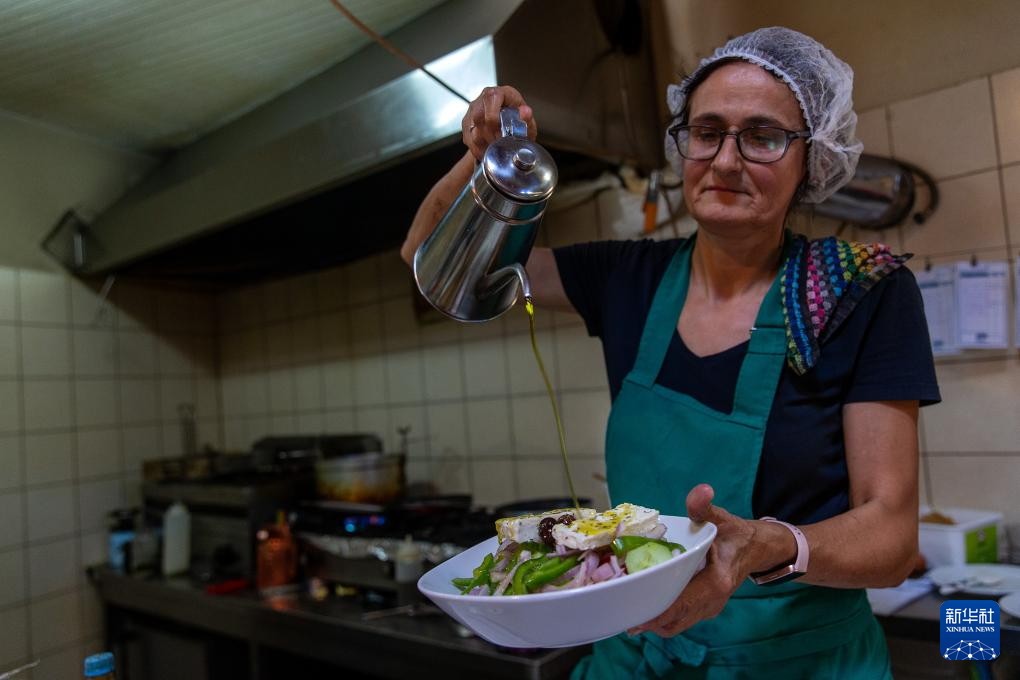 11月3日,在希腊伯罗奔尼撒半岛麦西尼亚,一名女子向沙拉上倒橄榄油。