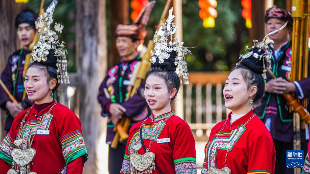 11月29日,侗族群众在黎平县肇兴侗寨寨门口演唱歌曲。