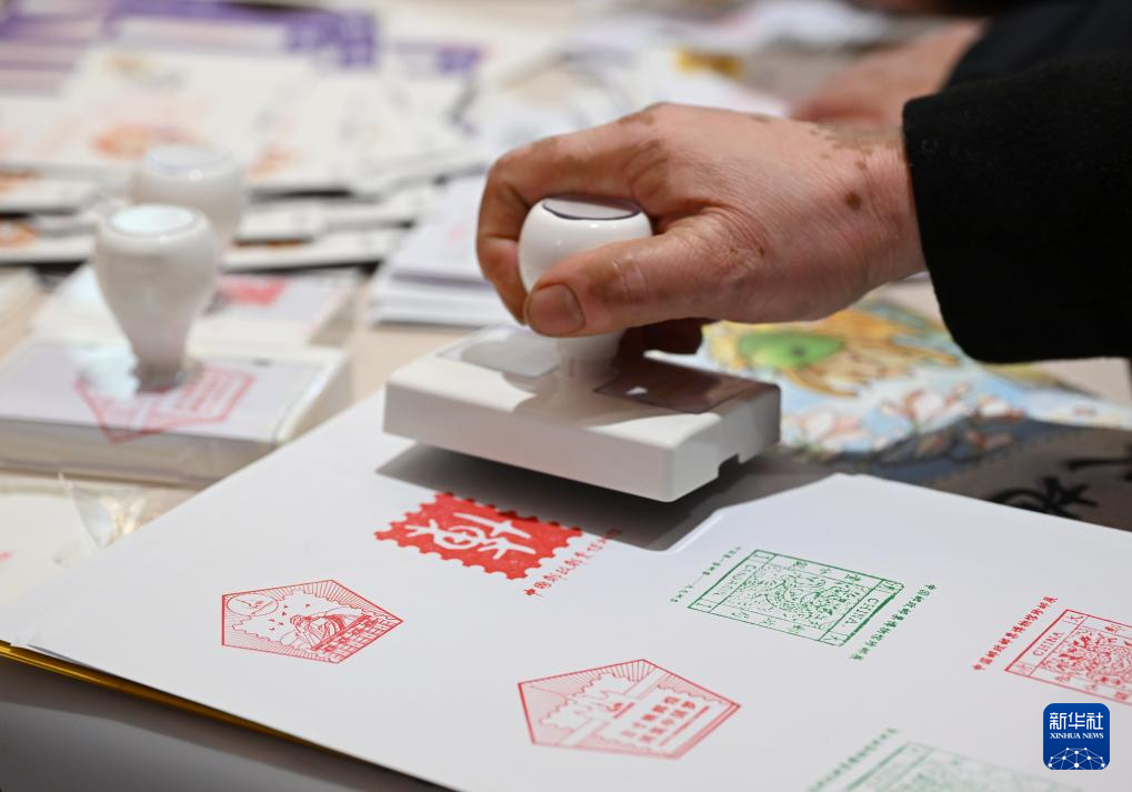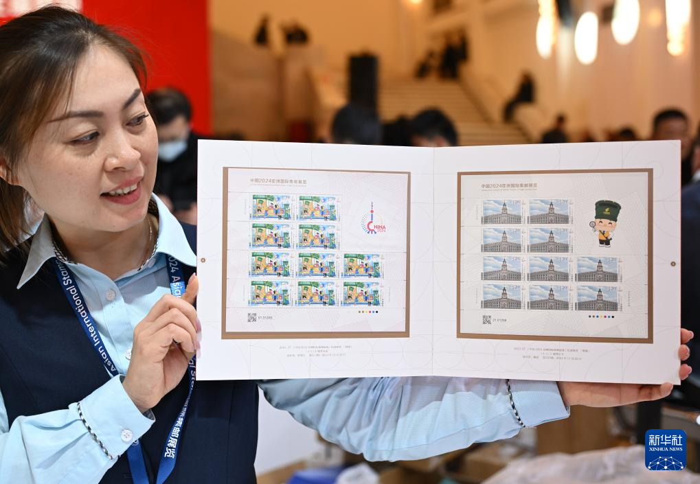 11月29日,工作人员展示中国邮政为本次集邮展览发行的纪念邮票。