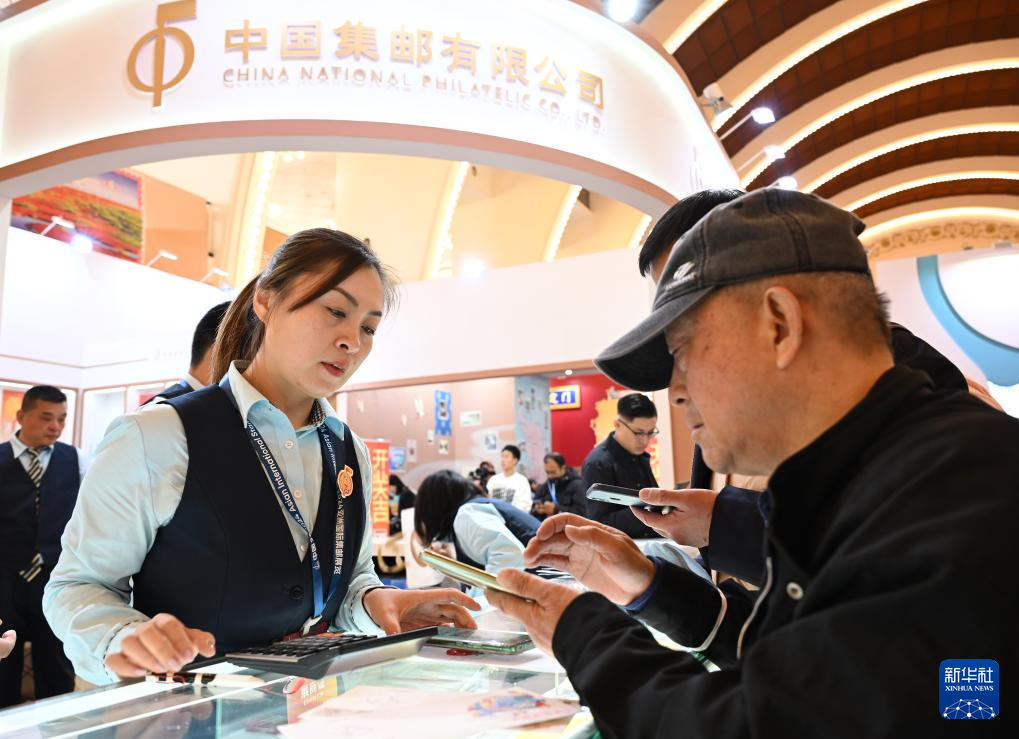11月29日,参观者在中国集邮有限公司展台选购邮品。