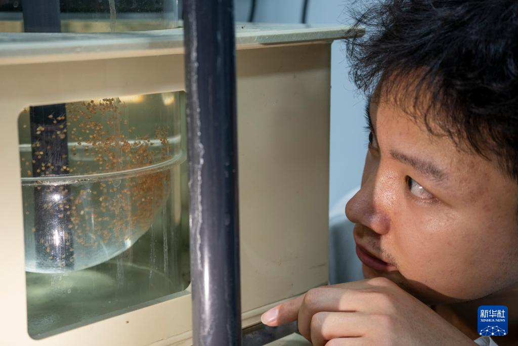 11月27日,在西部(重庆)科学城种质创制大科学中心养殖室,研究人员在对人工孵化的新品种罗非鱼鱼苗生长情况进行日常巡查。