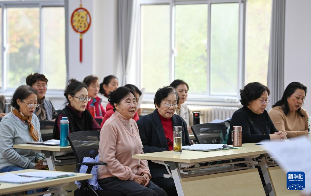 西安市未央区西重所社区夕阳红合唱团的成员在社区多功能活动室排练歌曲(11月21日摄)。