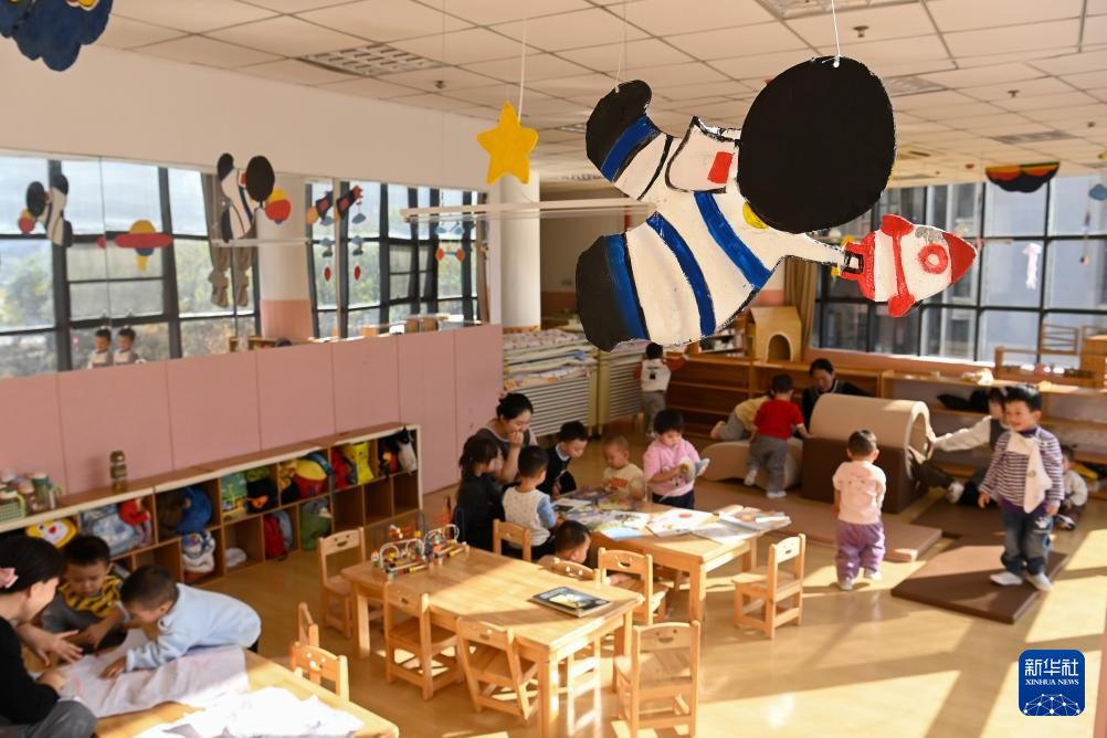 在西安市未央区浐灞半岛社区,西交小雅托育中心的老师带孩子们活动(11月28日摄)。