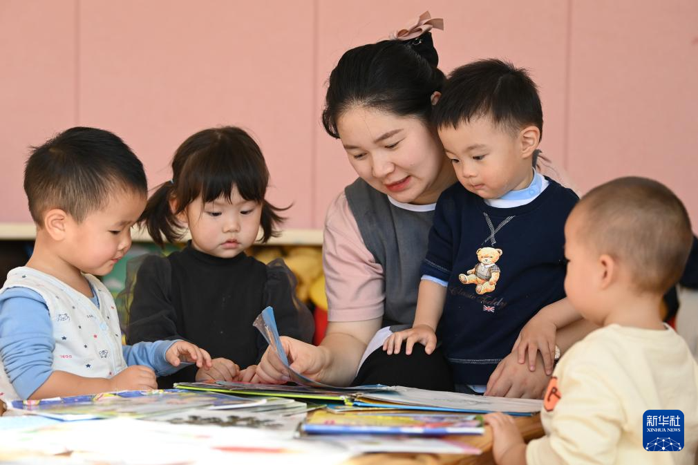 在西安市未央区浐灞半岛社区,西交小雅托育中心的老师带孩子们阅读绘本(11月28日摄)。