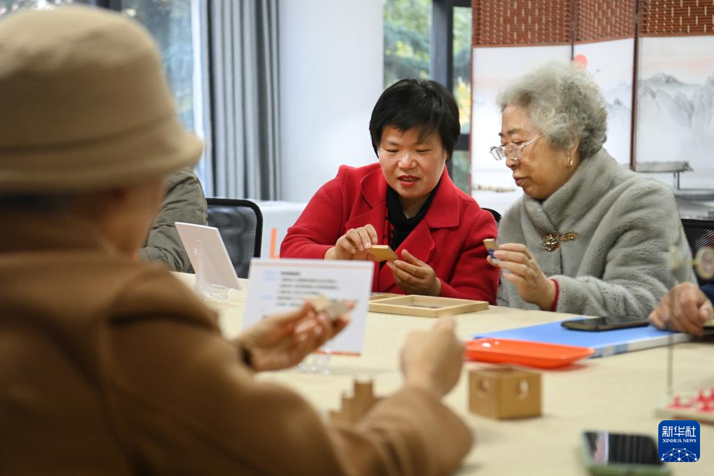 居民在西安市未央区浐灞半岛社区养老服务站做益智游戏(11月28日摄)。