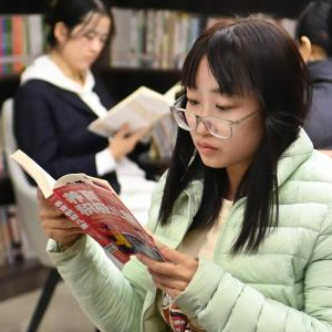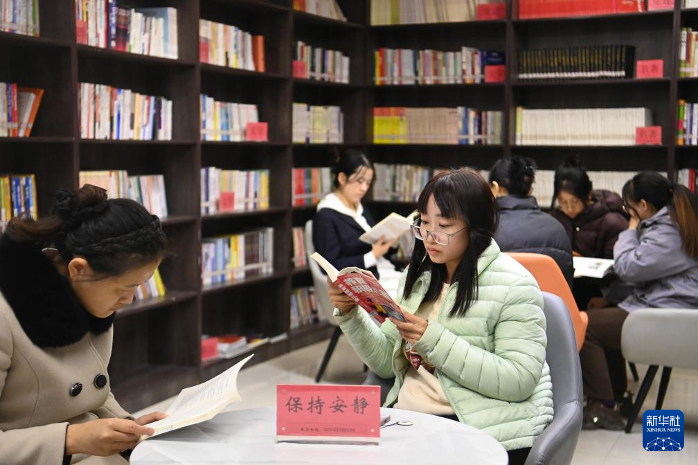 居民在西安市未央区浐灞半岛社区悦读驿站读书(11月29日)。