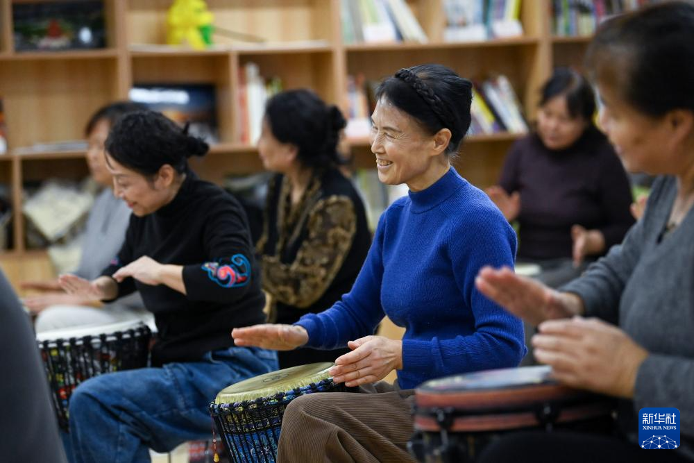 居民在西安市未央区凤凰城社区养老服务站上手鼓课(11月21日摄)。