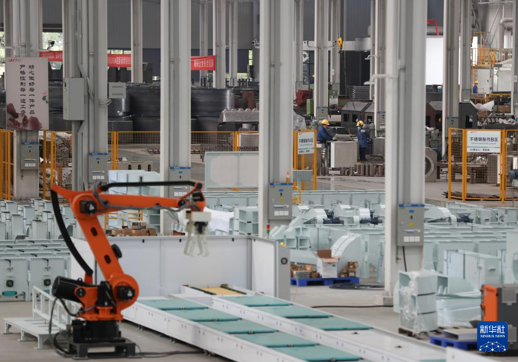 这是11月29日拍摄的湖南郴州粮油机械有限公司生产车间里的智能焊接机器人。