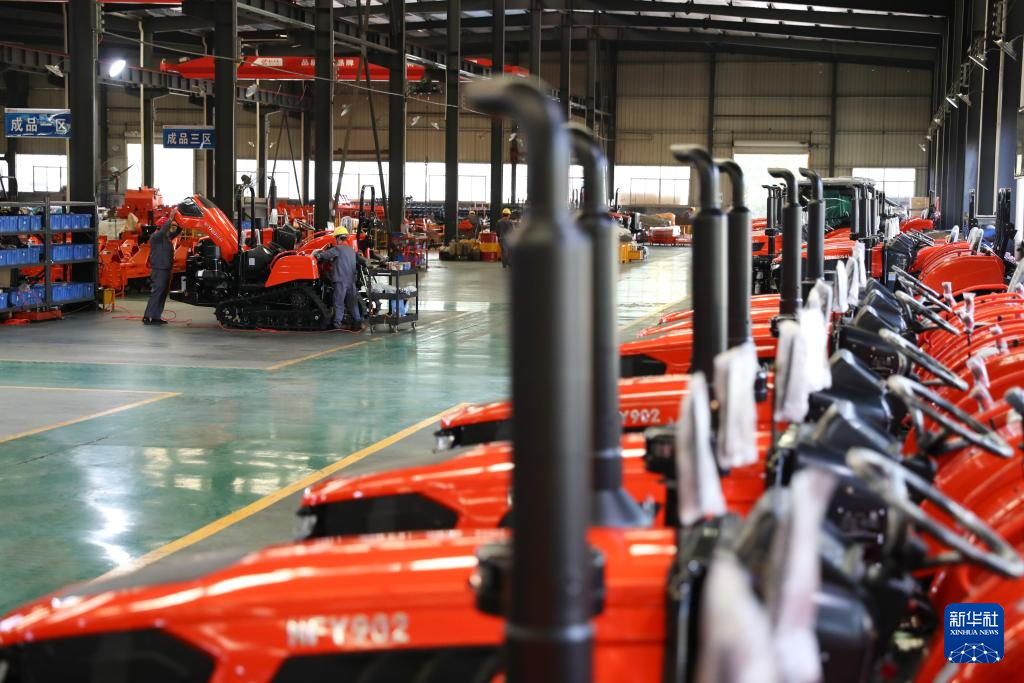11月29日,在湖南郴州的农夫机电有限公司车间里,工人对一台履带式拖拉机成品进行调试。