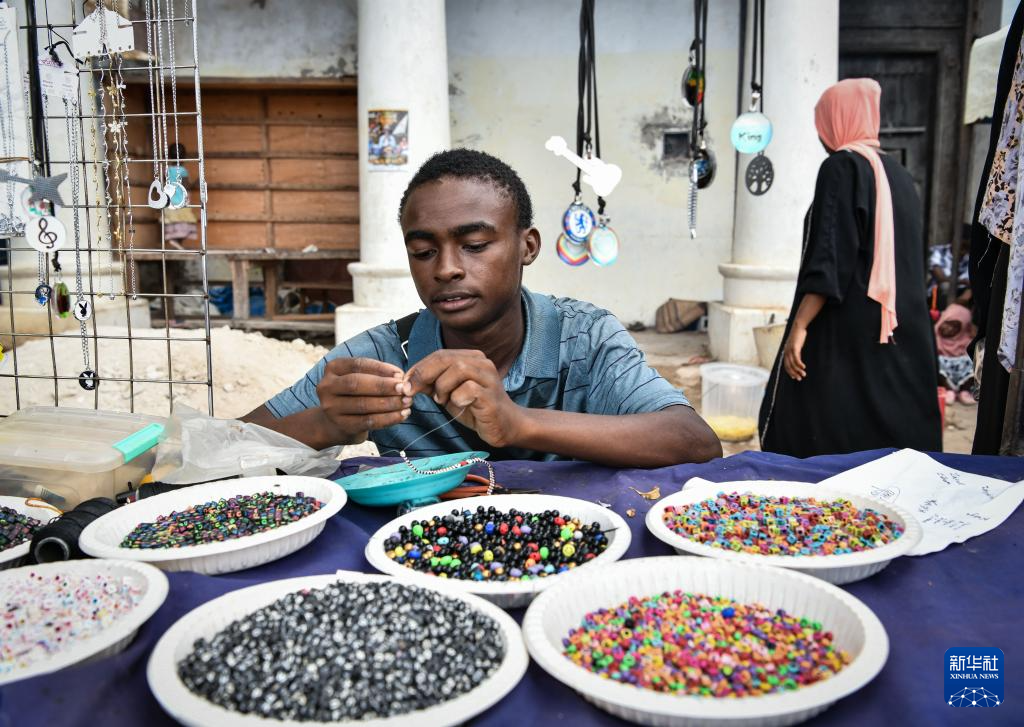 11月29日,在肯尼亚东部印度洋拉穆群岛上的拉穆古镇,一名商贩在拉穆文化节上制作手串。