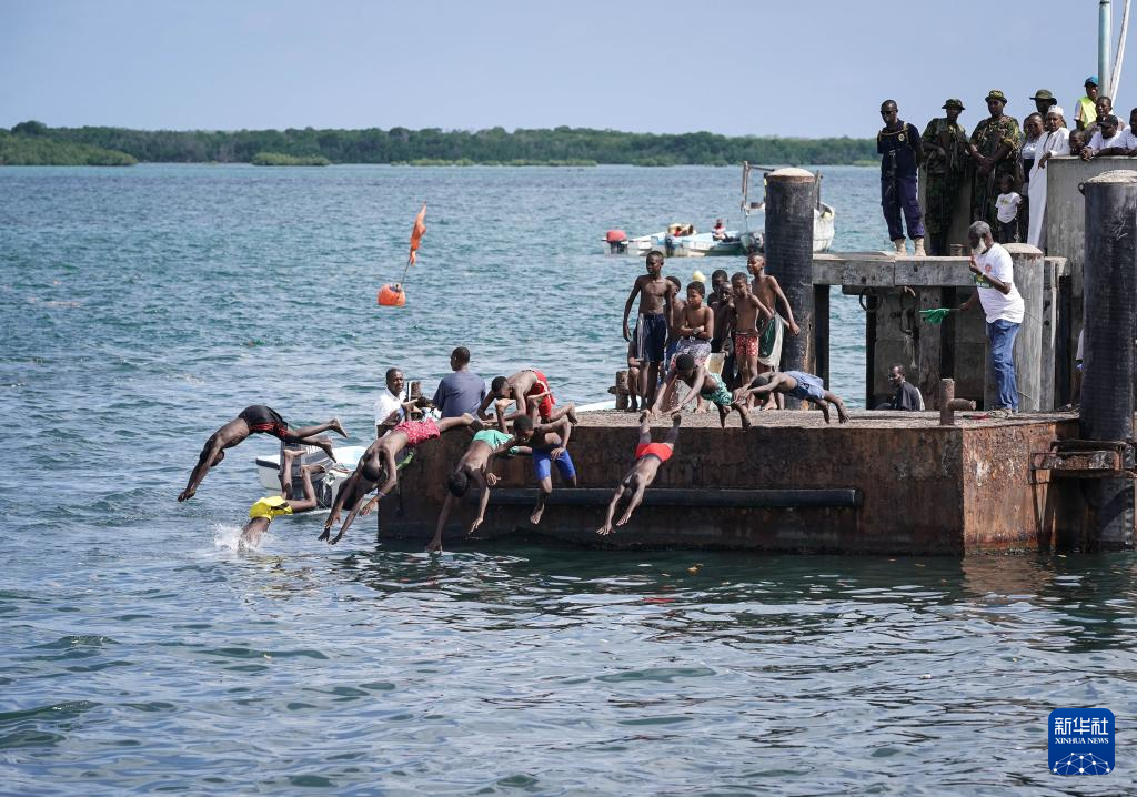 11月29日,在肯尼亚东部印度洋拉穆群岛上的拉穆古镇,当地少年在海中进行游泳比赛。