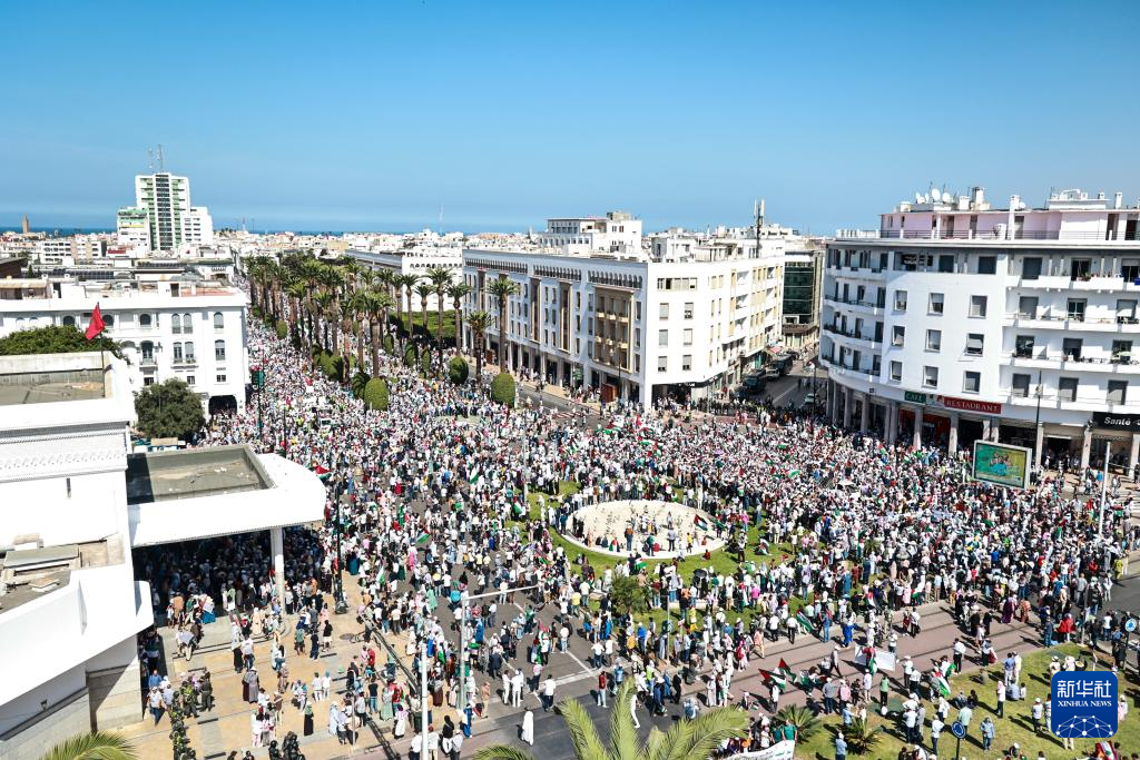 2024年10月6日,人们在摩洛哥首都拉巴特参加游行,声援巴勒斯坦民众。