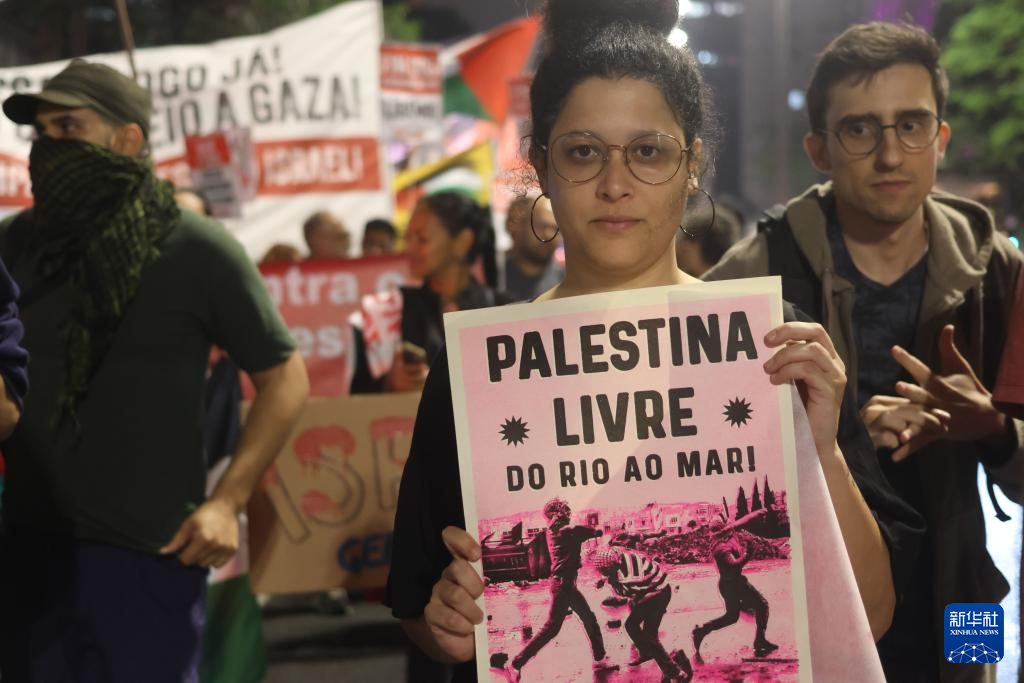 2024年10月8日,人们在巴西圣保罗的保利斯塔大街参加声援巴勒斯坦的示威游行。