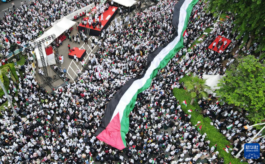 2024年1月13日,人们在印度尼西亚雅加达参加声援巴勒斯坦的集会(无人机照片)。
