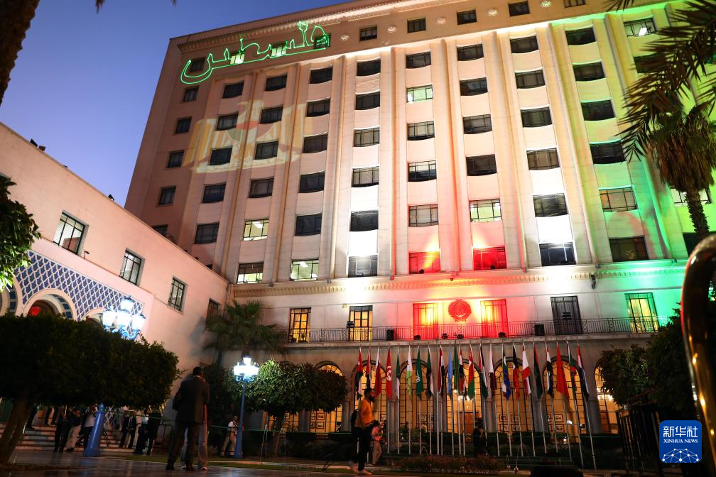 2023年10月11日,位于埃及首都开罗的阿盟总部亮起巴勒斯坦国旗颜色的灯光。