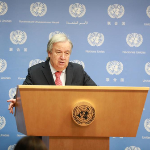 2023年11月6日,联合国秘书长古特雷斯在位于纽约的联合国总部举行的记者会上讲话。古特雷斯当日说,巴勒斯坦加沙地带的灾难令人道主义停火刻不容缓。