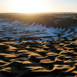 一场降雪过后,甘肃省酒泉市阿克塞哈萨克族自治县境内的库木塔格沙漠连绵起伏的沙丘在落日余晖下泛出层层金色光芒,夕阳与白雪映衬下的沙漠呈现冬日壮美画卷。
