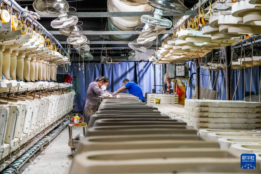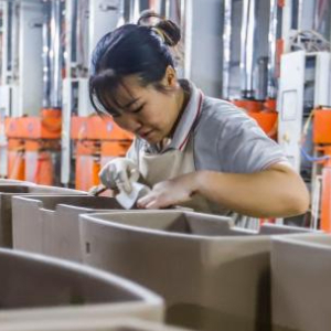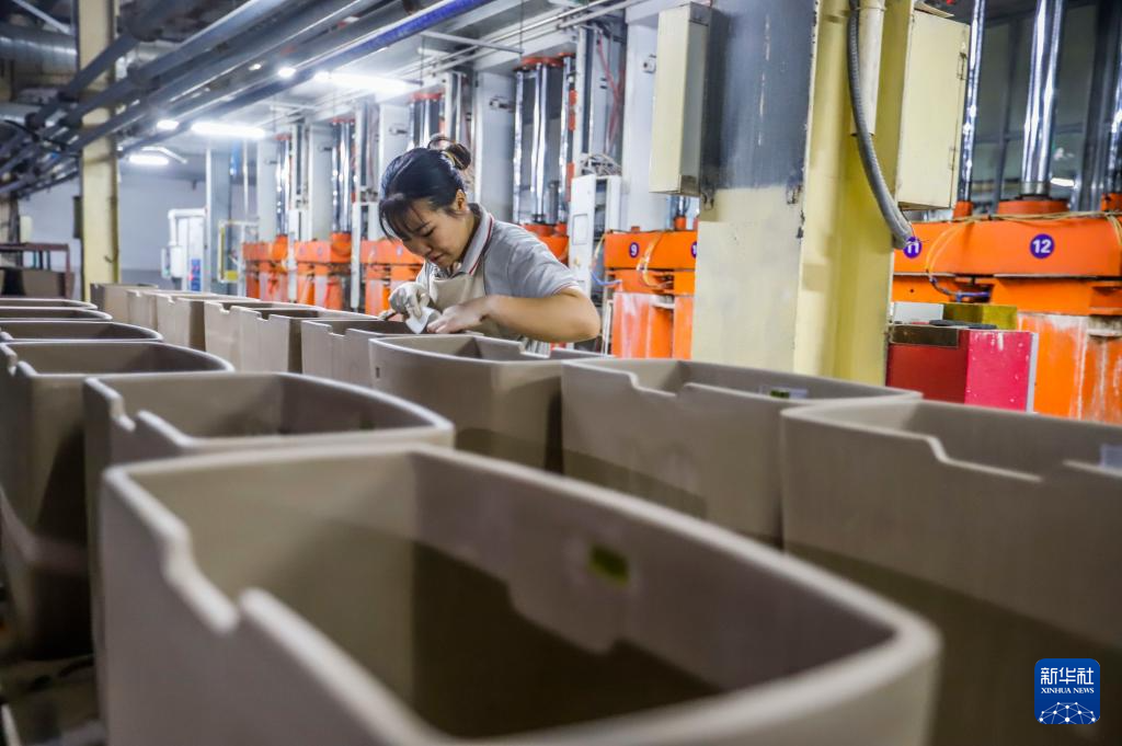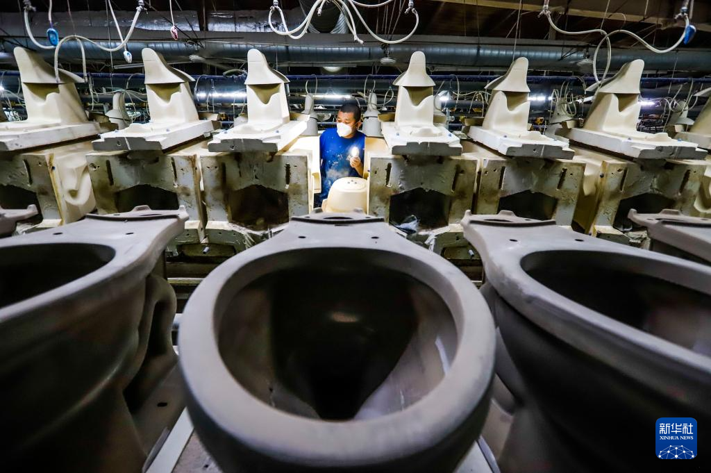 11月29日,工人在唐山市海港经济开发区的一家卫浴出口企业车间工作。