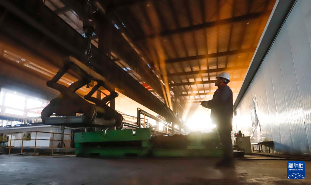 11月29日,工人在唐山市海港经济开发区的一家出口金属板材企业车间吊运钢坯。