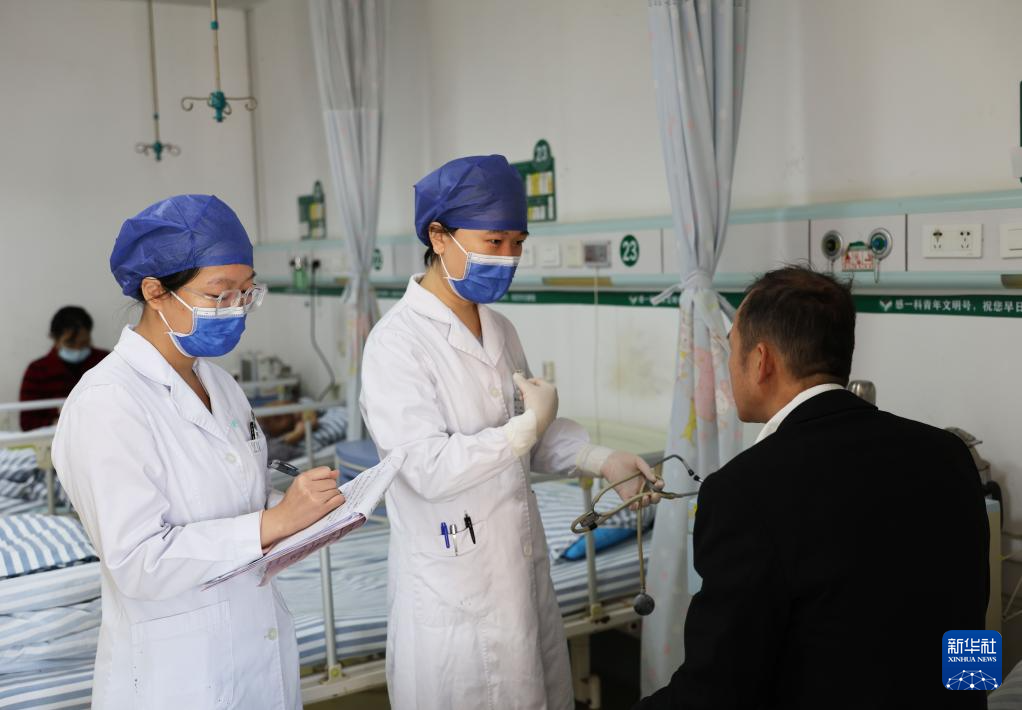 11月21日,在南宁市第四人民医院感染科一病区病房,赵蕊(中)询问病人病情。
