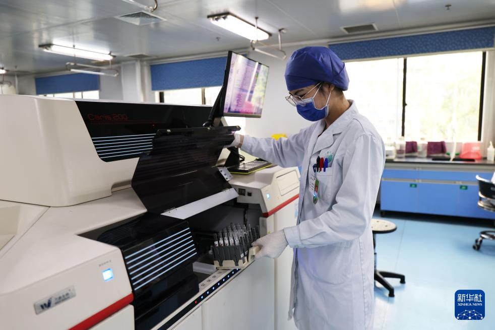 11月21日,在南宁市第四人民医院检验科免疫室,医生使用仪器对样本进行艾滋病病毒检测。