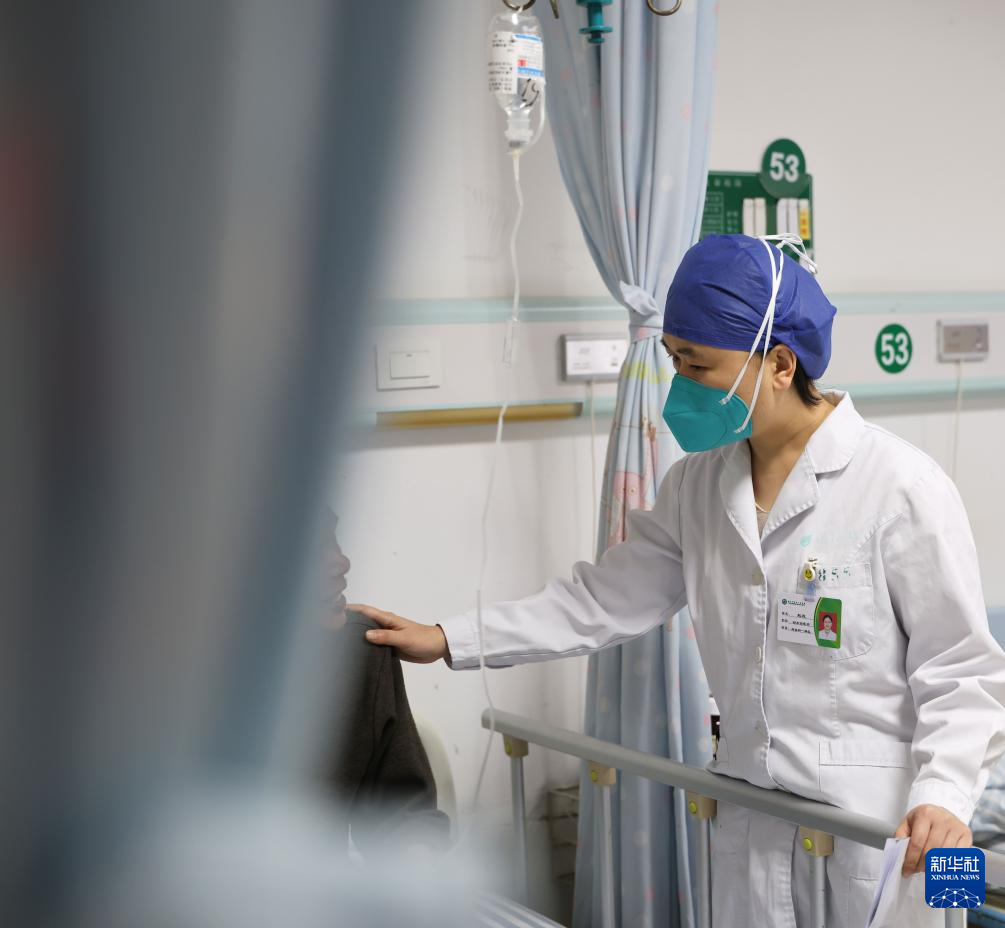 11月24日,在南宁市第四人民医院感染科一病区病房,赵蕊对病人进行诊疗操作。