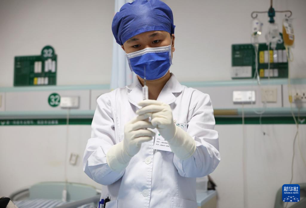 11月24日,在南宁市第四人民医院感染科一病区,护士为病人配药。