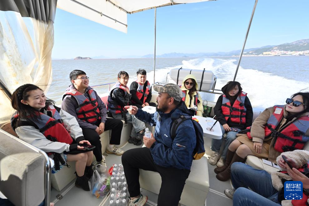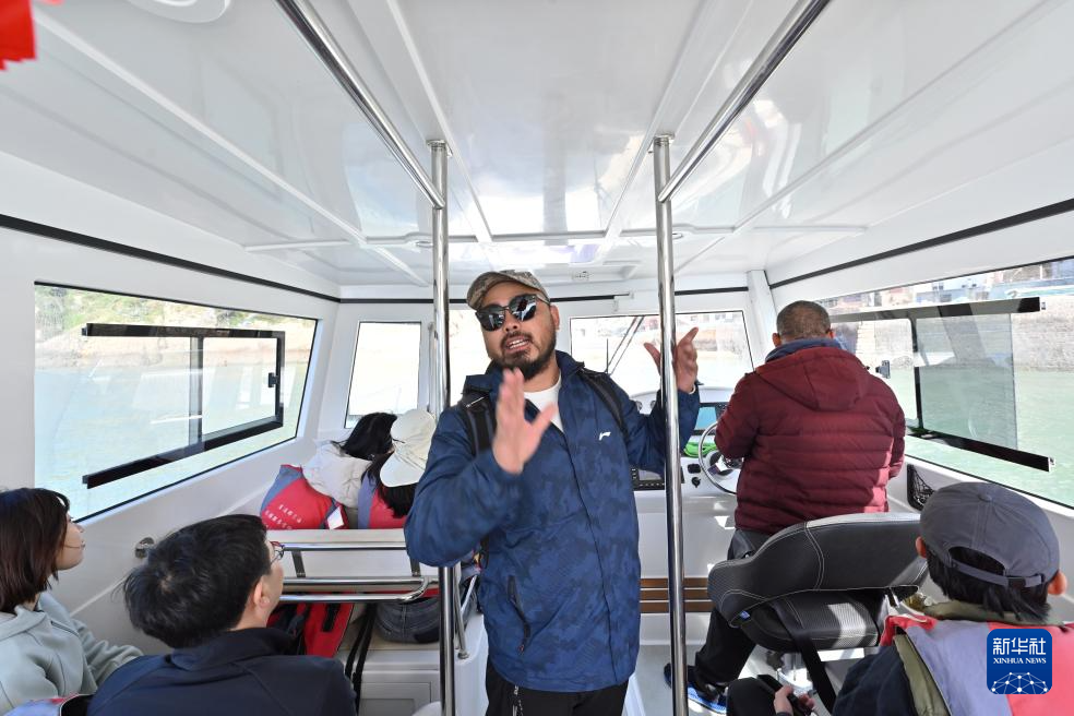 11月29日,姜瑜(前中)在游船上向游客讲解霞浦县海岛旅游风土人情。