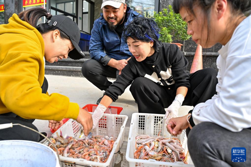 11月30日,在霞浦县长春镇吕峡村,姜瑜(左二)与一家餐馆经营人员一起挑选刚打捞的海鲜。